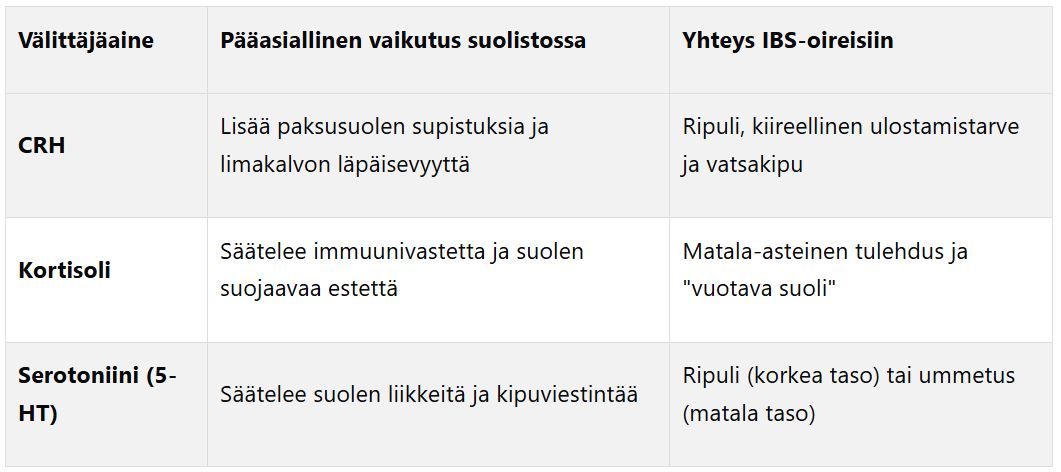 Aivojen ja suoliston väliset välittäjäaineet toimivat keskeisinä linkkeinä stressin ja vatsaoireiden välillä. Serotoniini (5-HT) on tässä erityisen tärkeä, ja noin 90–95 % kehon serotoniinista sijaitsee suolistossa. Nykytutkimus korostaa, että IBS:ssä ongelma ei ole vain serotoniinin määrä, vaan sen vapautumisen, reseptorivasteiden ja takaisinoton säätely. Stressi voi muuttaa serotoniinivälitteistä viestintää siten, että suolen liikkeet kiihtyvät tai hidastuvat ja kipuherkkyys lisääntyy.